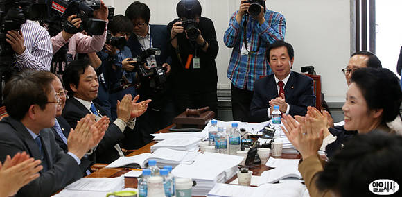 새누리당 김성태 간사와 환노위원들이 23일 오후, 국회 환경노동위원회 법안심사소위원회에서 웃으면서 박수를 치고 있다. 이날 환노위 법안심사소위는 근로자의 정년을 60세로 의무화하는 이른바 '정년 연장법안'을 통과시켰다.