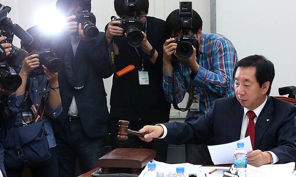 23일 오후, 국회 환경노동위원회 법안심사소위원회에서 새누리당 김성태 간사가 의사봉을 두드리고 있다. 환노위 법안심사소위는 이날 근로자의 정년을 60세로 의무화하는 이른바 '정년 연장법안'을 전격 통과시켰다.