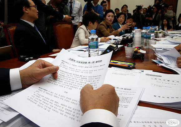 국회 환경노동위원회 법안심사소위원회에서 근로자의 정년을 60세로 의무화하는 이른바 '정년 연장법안'과 관련된 자료를 한 환노위원이 손에 들고 있다.