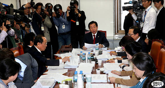 23일 오후, 국회 환경노동위원회 법안심사소위원회에서 새누리당 김성태 간사(사진 가운데)가 소위를 진행하고 있다. 환노위 법안심사소위는 근로자의 정년을 60세로 의무화하는 이른바 '정년 연장법안'을 통과시켰다.