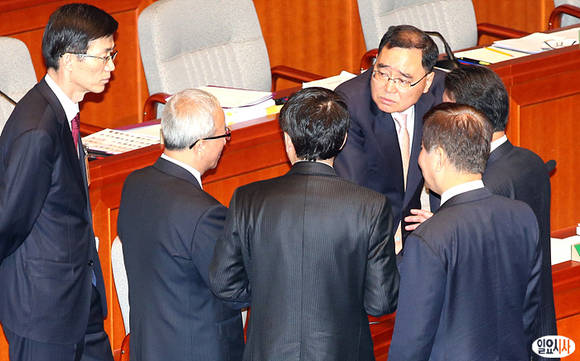 국회 예결위가 24일, 야당의 추경 예산안 관련 총리 대국민 사과 요구로 정회된 가운데 정홍원 총리가 현오석 경제 부총리 및 관계 공무원들과 대책을 논의하고 있다.