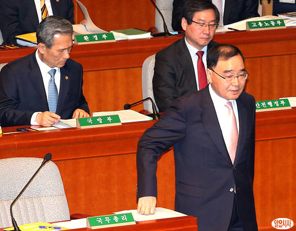 정홍원 국무총리가 24일 추경예산안 심의를 위해 열린 국회 예산결산특별위원회 전체회의에 참석, 발언을 하기에 앞서 인사하기 위해 단상으로 이동하고 있다.