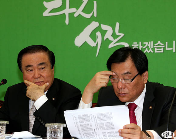 문희상 민주통합당 비상대책위원장과 박기춘 원내대표가 24일, 서울 여의도 국회에서 열린 비상대책위원회의에 참석해 다른 생각을 하고 있다.