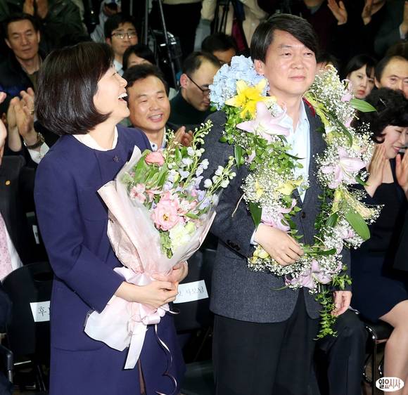 4.24 재보궐 선거에서 서울 노원병 국회의원 당선이 확정된 안철수 무소속 후보가 24일 오후 서울 상계동에 위치한 선거사무소에서 축하 꽃다발을 목에 건 채 부인 김미경 교수와 함께 미소를 짓고 있다.