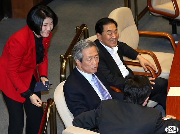 25일 국회 본회의에서 열린 정치·외교·통일·안보 분야 대정부질문에서 새누리당 정몽준(사진 가운데), 이재오(사진 오른쪽), 손인춘 의원이 담소를 나누고 있다.