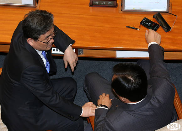 이한구 새누리당 원내대표(오른쪽)와 박기춘 민주통합당 원내대표가 25일 국회 본회의장에서 정치·외교·통일·안보 분야 대정부질문에서 얘기를 나누고 있다.