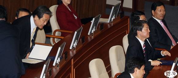 4.24 재보선에서 당선된 새누리당 김무성 의원이 26일 오전 서울 여의도 국회에서 열린 본회의에서 앞자리에 앉은 무소속 안철수 의원을 바라보고 있다.
