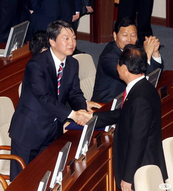 4·24 재보선 서울 노원병 국회의원에 당선된 무소속 안철수 의원이 26일 오전 서울 여의도 국회에서 열린 본회의에 참석해 동료의원들과 인사를 나누고 있다.