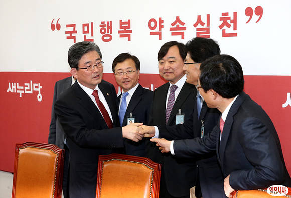 이한구 새누리당 원내대표와 경제5단체장 부회장단이 29일 오전 국회 새누리당 원내대표실에서 면담 후 악수를 나누고 있다.