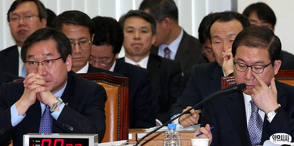 29일 서울 여의도 국회에서 열린 안전행정위원회 전체회의에서 유정복 안전행정부 장관(사진 왼쪽)과 이성한 경찰청장이 상기된 표정으로 의원들의 질의를 경청하고 있다.