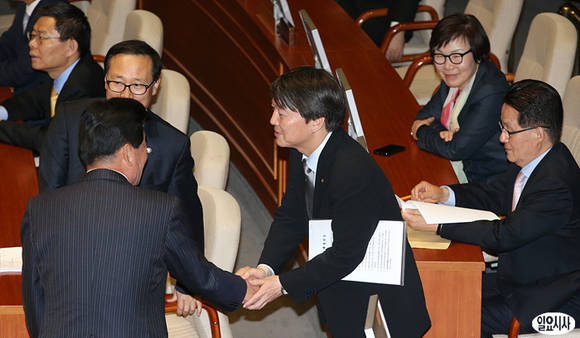 민주통합당 김진표 의원(사진 오른쪽)과 무소속 안철수 의원이 29일 오후, 국회 본회의에 참석해 악수를 나누고 있다.
