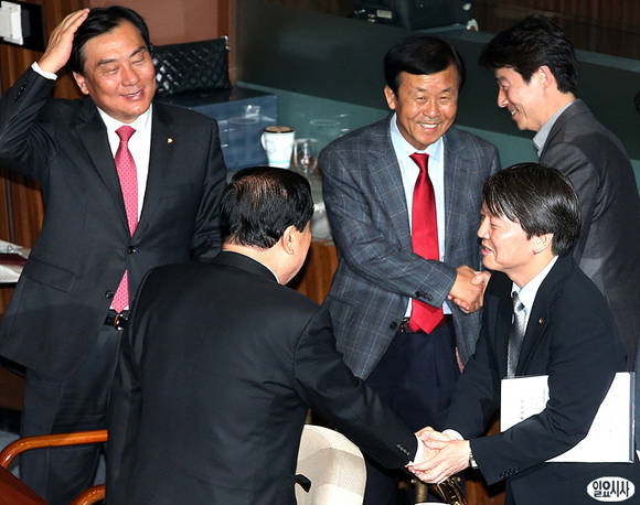 민주통합당 문희상 비대위원장(사진 왼쪽)과 무소속 안철수 의원이 29일 오후, 국회 본회의에 참석해 서로 악수를 나누고 있다.
