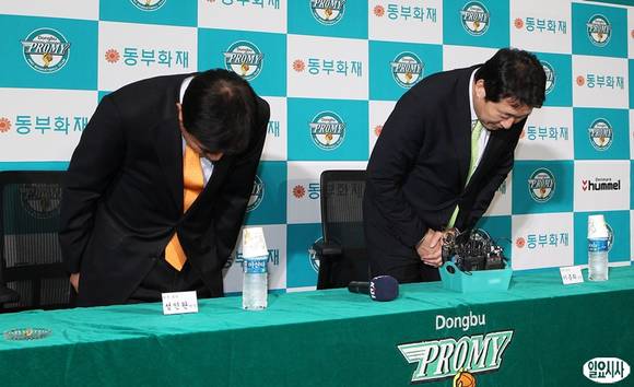 프로농구 원주 동부프로미 새 사령탑에 선임된 이충희 감독(오른쪽)이 30일 오전 서울 강남구 KBL센터에서 취임 기자회견을 갖기 앞서 고개 숙여 인사하고 있다. 왼쪽은 원주 동부 성인완 단장.