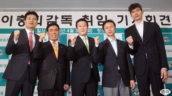 프로농구 원주 동부프로미 새 사령탑에 선임된 이충희 감독이 30일 오전 서울 강남구 KBL센터에서 취임 기자회견을 마친 뒤 포토타임을 갖고 있다. 사진 왼쪽부터 김영만 코치, 성인완 단장, 이충희 감독, 이세범 코치, 김주성 선수.