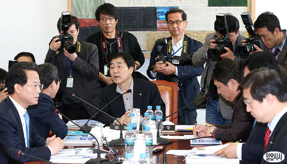 현오석 경제부총리 겸 기획재정부 장관이 출석한 가운데 30일 오전 국회 추경 예산안 세부심의를 위한 예산결산특별위원회 조정소위(위원장 새누리당 장윤석) 도중 장윤석 위원장이 김학용 새누리당 간사(사진 왼쪽)와 대화를 나누고 있다.