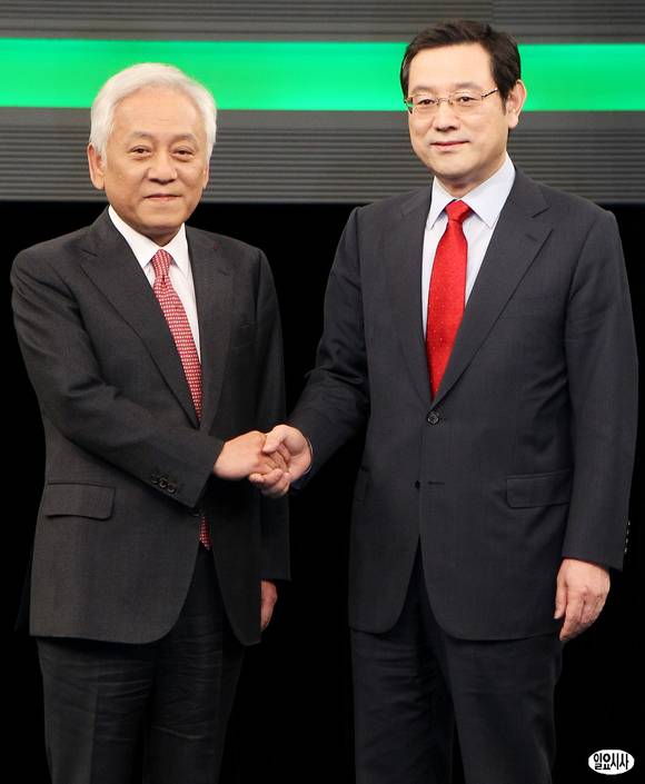 민주통합당 당대표 경선에 출마한 (왼쪽부터)김한길, 이용섭 후보가 30일 오후 서울 여의도 KBS본관에서 열린 민주통합당 대표 후보 초청 토론회에서 악수하고 있다.