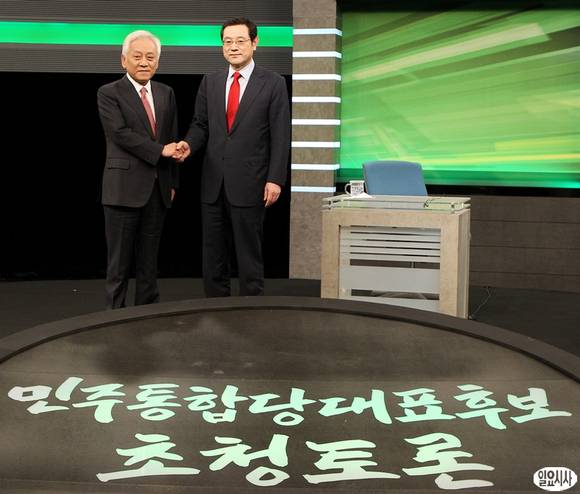 민주통합당 당대표 경선에 출마한 (왼쪽부터)김한길, 이용섭 후보가 30일 오후 서울 여의도 KBS본관에서 열린 민주통합당 대표 후보 초청 토론회에서 악수하고 있다.