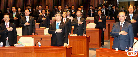 30일 오후 국회에서 열린 새누리당 의원총회 직전, 황우여 대표(사진 오른쪽), 이한구 원내대표(사진 앞 가운데)를 비롯한 새누리당 의원들이 국기에 대한 경례를 하고 있다.