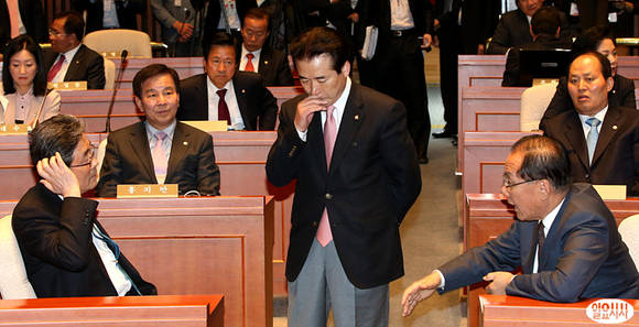 총회에서 황우여 대표(사진 오른쪽), 이한구 원내대표(사진 왼쪽), 나성린 정책위의장이 대화를 나누고 있다.