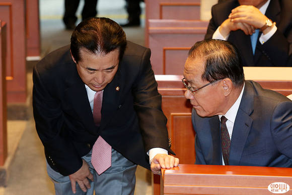30일 오후 국회에서 열린 새누리당 의원총회에서 황우여 대표(사진 오른쪽)과 나성린 정책위의장이 귀엣말을 나누고 있다.