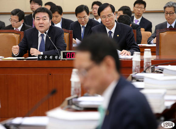 30일 오후 국회 법제사법위원회는 대기업의 이른바 납품단가 후려치기에 대한 징벌적 손해 배상을 강화하는 내용의 하도급법 개정안을 통과시킨 가운데 신제윤 금융위원장(사진 왼쪽)이 발언하고 있다.
