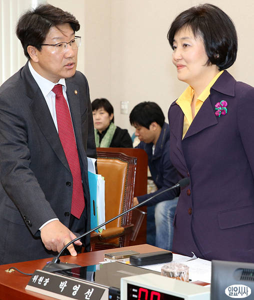 30일 오후 국회 법제사법위원회가 대기업의 이른바 납품단가 후려치기에 대한 징벌적 손해 배상을 강화하는 내용의 하도급법 개정안을 통과시킨 가운데 박영선 법사위원장(사진 오른쪽)이 새누리당 권성동 간사와 이야기를 나누고 있다.
