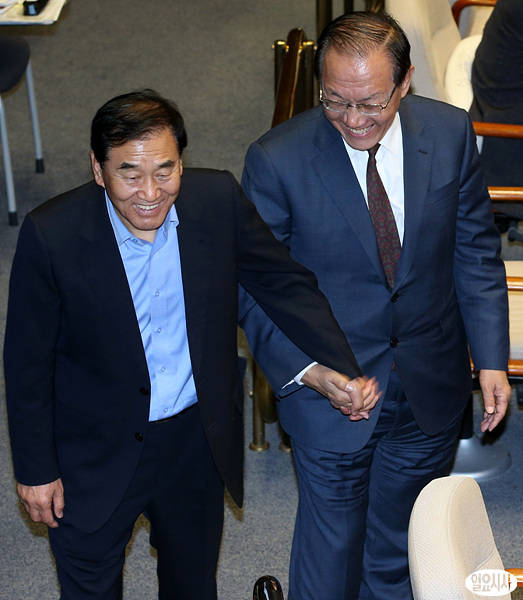 30일 서울 여의도 국회에서 열린 본회의장에서 이재오 의원(사진 왼쪽)과 황우여 대표가 악수를 나누며 웃고 있다.