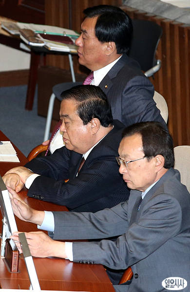 민주통합당 이해찬 의원이 30일 오후, 국회 본회의장에서 심각한 표정으로 모니터를 쳐다보고 있다.