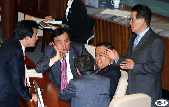 30일 오후, 국회 본회의장 안에서 민주통합당 문희상 비대위원장, 박지원 전 원내대표 등이 심각한 표정으로 이야기를 나누고 있다.