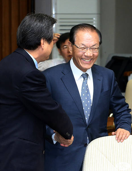 1일 오전, 국회에서 열린 새누리당 최고중진연석회의에서 황우여 대표가 김무성 의원(사진 왼쪽)과 악수를 나누며 활짝 웃고 있다.