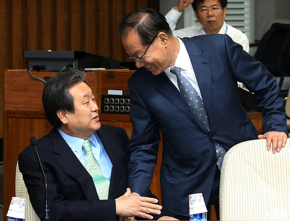 1일 오전, 국회서 열린 새누리당 최고중진연석회의에서 황우여 대표(사진 오른쪽)와 김무성 의원이 활짝 웃으며 악수를 나누고 있다.