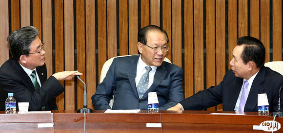 1일 오전, 국회에서 열린 새누리당 최고중진연석회의에서 황우여 대표(사진 가운데)와 이한구 원내대표(사진 왼쪽), 이인제 의원이 이야기를 나누고 있다.