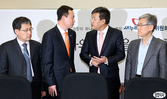 1일 오전 국회에서 열린 개성공단 입주기업 지원TF 당정회의에서 김남식 통일부 차관과 정문헌 의원이 대화하고 있다.