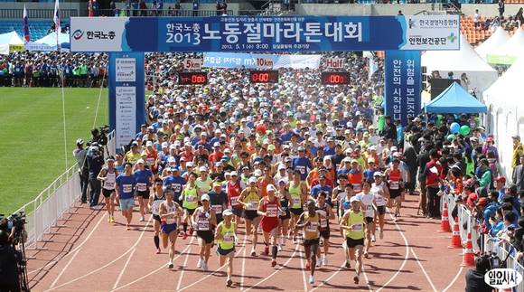 근로자의 날인 1일 오전 서울 송파구 잠실동 올림픽주경기장에서 열린 '2013년 노동절 마라톤 대회'에서 참가자들이 힘차게 출발하고 있다.