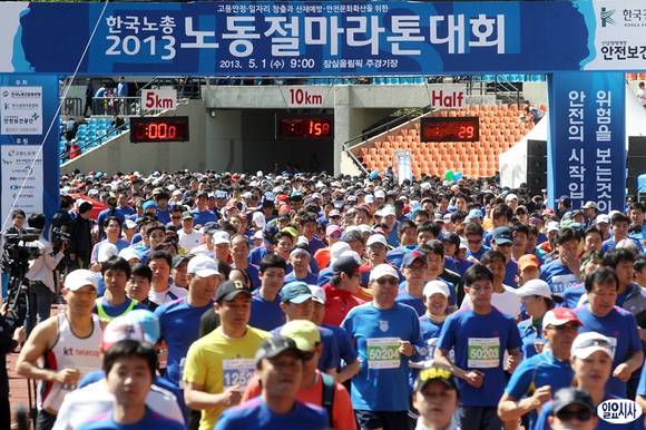 근로자의 날인 1일 오전 서울 송파구 잠실동 올림픽주경기장에서 열린 '2013년 노동절 마라톤 대회'에서 수많은 참가자들이 힘차게 출발하고 있다.