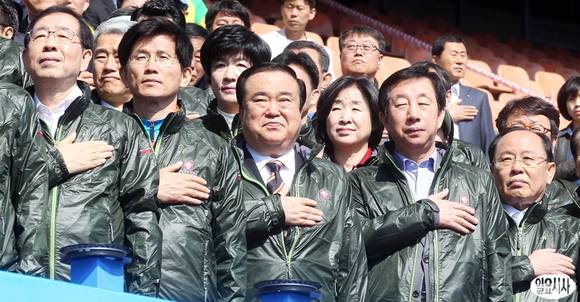 근로자의 날인 1일 오전 서울 송파구 잠실동 올림픽주경기장에서 열린 '2013년 노동절 마라톤 대회'에 문희상 민주통합당 비상대책위원장을 비롯한 내빈들이 국기에 대한 경례를 하고 있다. 사진 왼쪽부터 박원순 서울시장, 김문수 경기도지사, 문희상 민주통합당 비대위원장, 김성태 새누리당 의원 등.