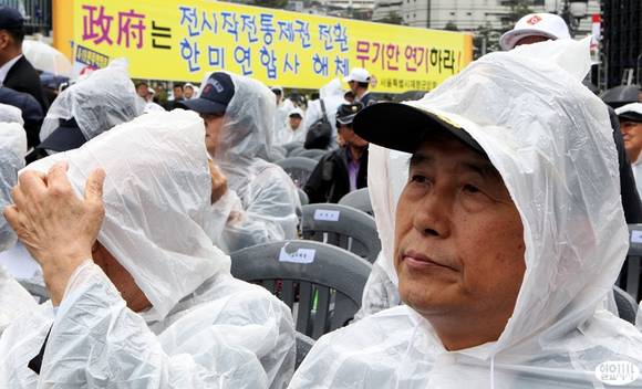 대한민국 재향군인회와 호국보훈안보단체연합회 회원들이 2일 오후 서울역광장에서 열린 '전작권 전환 및 한미연합사 해체 연기 촉구 국민대회'에 참석한 가운데 한 회원이 결연한 표정을 짓고 있다.