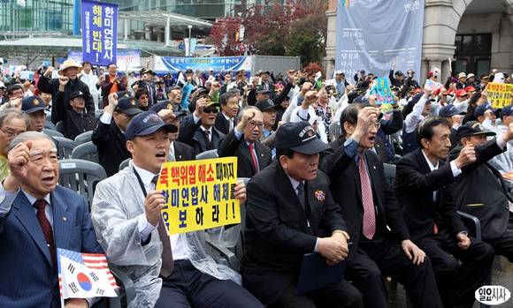 대한민국 재향군인회와 호국보훈안보단체연합회 회원들이 2일 오후 서울역광장에서 열린 '전작권 전환 및 한미연합사 해체 연기 촉구 국민대회'에 참석해 구호를 외치고 있다.