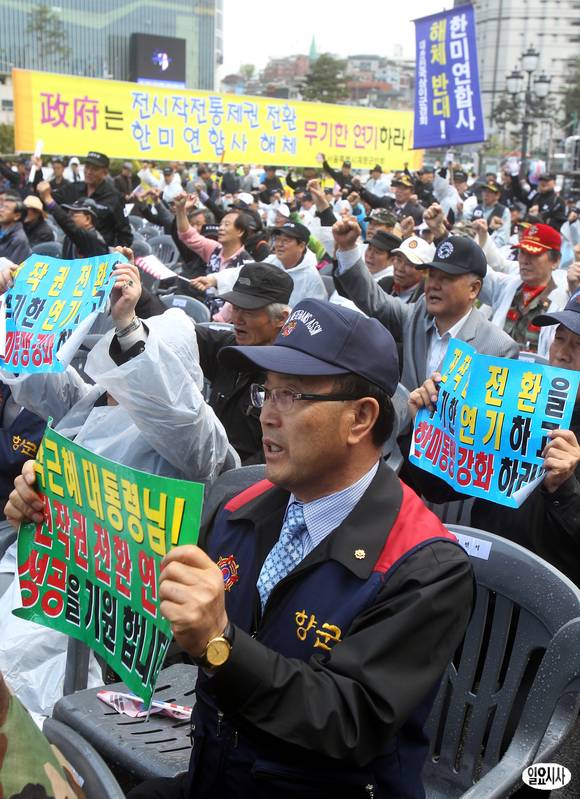 대한민국 재향군인회와 호국보훈안보단체연합회 회원들이 2일 오후 서울역광장에서 열린 '전작권 전환 및 한미연합사 해체 연기 촉구 국민대회'에 참석해 구호를 외치고 있다.