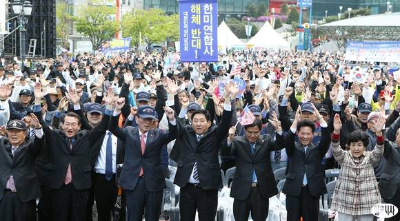 대한민국 재향군인회와 호국보훈안보단체연합회 회원들이 2일 오후 서울역광장에서 열린 '전작권 전환 및 한미연합사 해체 연기 촉구 국민대회'에 참석해 만세삼창을 하고 있다.