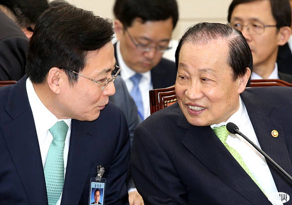 이경재 방송통신위원회 위원장(사진 오른쪽)이 2일 오후 서울 여의도 국회에서 열린 미래창조과학방송통신위원회 전체회의에 출석해 박만 방송통신심의위원장과 대화를 나누고 있다.