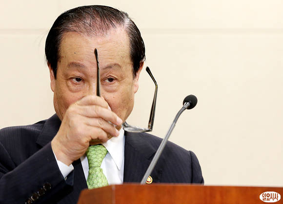 이경재 방송통신위원회 위원장이 2일 오후 서울 여의도 국회에서 열린 미래창조과학방송통신위원회 전체회의 직전, 안경을 벗고 있다.