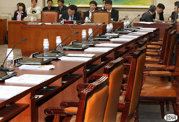 2일 오후 서울 여의도 국회 정무위원회 회의실에서 전체회의가 열린 가운데 정회 중 의원들이 자리를 이탈해 신제윤 금융위원장과 관계자들만 덩그러니 착석해 있다.