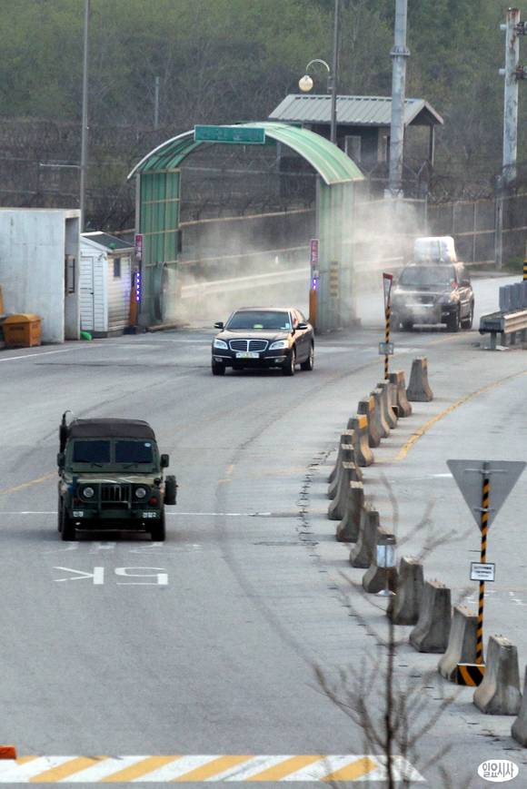 개성공단에 마지막으로 잔류했던 우리측 인원 7명을 태운 차량이 3일 오후 경기 파주시 남북출입사무소를 통해 귀환하고 있다.