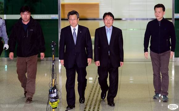 개성공단에 마지막으로 잔류했던 우리측 인원 7명이 귀환한 3일 오후 경기 파주시 남북출입사무소에서 홍양호 이사장(왼쪽에서 두번째)을 비롯한 관계자들이 기자회견을 하기 위해 입경장으로 들어오고 있다.
