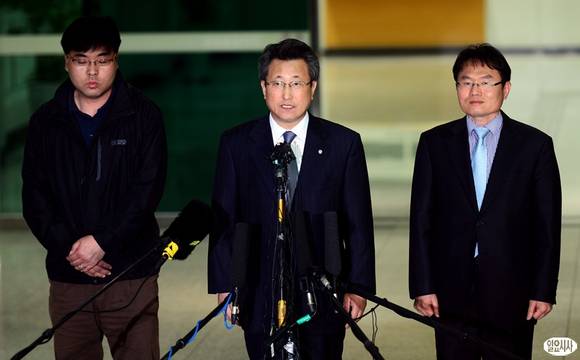 개성공단에 마지막으로 잔류했던 우리측 인원 7명이 귀환한 3일 오후 경기 파주시 남북출입사무소에서 홍양호 위원장이 입경 후 기자회견을 하고 있다.