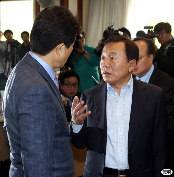 3일 오후 서울 여의도 중소기업중앙회에서 열린 개성공단기업협회 긴급 임시총회에서 한재권 회장(오른쪽)이 문창섭 비대위 공동위원장과 대화를 나누고 있다. 이날 개성공단기업협회는 개성공단 조업 중단과 근무자 철수에 따른 후속 대책을 마련하기 위해 `개성공단 정상화 촉구 비상대책위원회'를 발족했다.