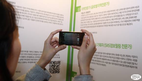 3일 오후 서울 서대문구 이화여대에서 열린 '2013 서울시 여대생 일자리박람회'에서 한 참가자가 취업정보를 스마트폰에 담고 있다.