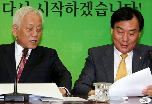 김한길 민주당 대표(사진 왼쪽)와 박기춘 원내대표가 6일 오전 서울 여의도 국회 민주당대표실에서 열린 최고위원회의에서 대화를 나누고 있다.