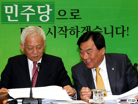김한길 민주당 대표(사진 왼쪽)와 박기춘 원내대표가 6일 오전 서울 여의도 국회 민주당대표실에서 열린 최고위원회의에서 웃는 표정으로 자료를 보고 있다.